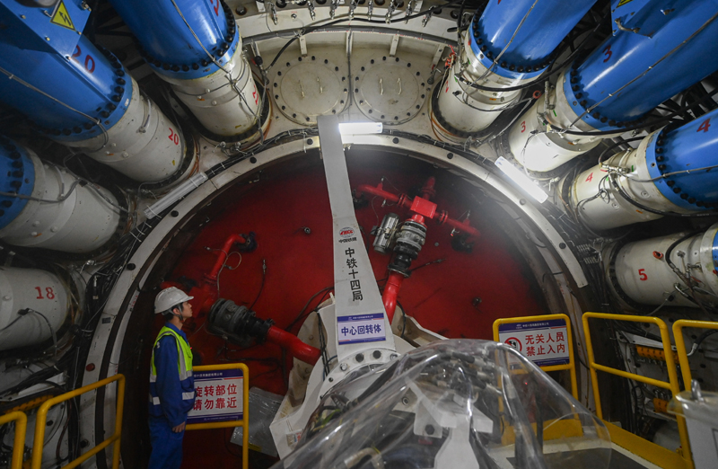 12月24日,中铁十四局技术人员在甬舟铁路金塘海底地道“甬舟号”盾构机内作业。