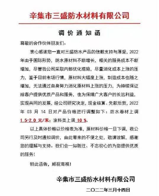 另外,中建友、三盛防水、汇兰德防水、欣城防水都在近期正式发布了涨价通知。中建友防水在调价通知函中表示,新价格将于3月31日起开始实施,产品调整幅度为10%—15%。