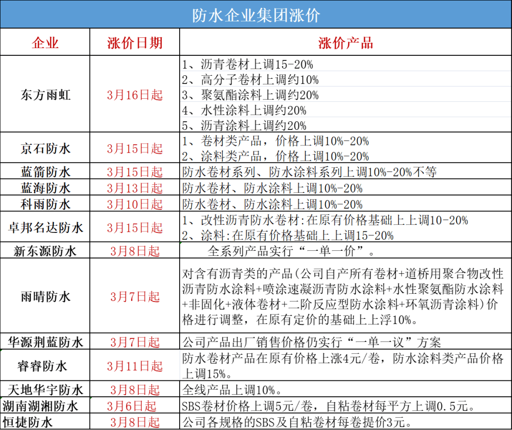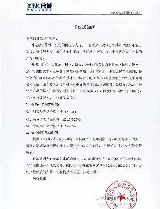3月16日,新京喜(唐山)建材有限公司在发布的调价函中表示,决定于2022年03月31日起对产品进行价格调整,改性沥青防水卷材:在原有价格基础上上调10-15%;高分子防水卷材:在原有价格基础上上调10-15%;水性涂料:在原有价格基础上上调15-20%;聚氨酯防水涂料:在原有价格基础上上调15-20%。