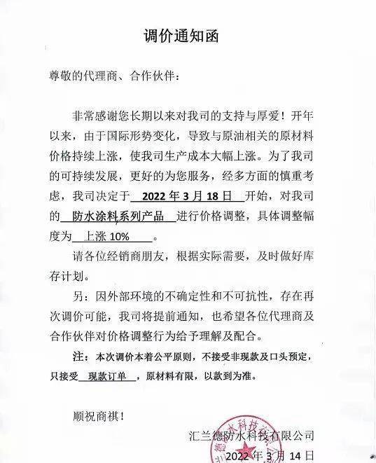 汇兰德防水表示,将于2022年3月18日开始,对防水涂料系列产品进行价格调整,具体调整幅度为上涨10%。